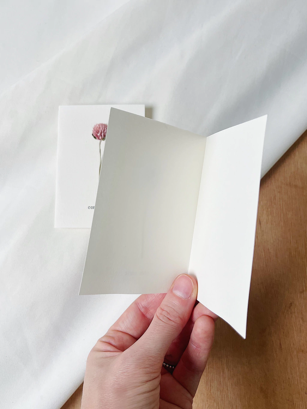 Decorado com uma delicada Perpétura rosa desidratada, nosso cartão botânico tem a parte interna em branco para que você possa expressar seus sentimentos em diversas ocasiões: aniversários, agradecimentos, datas comemorativas e muito mais.