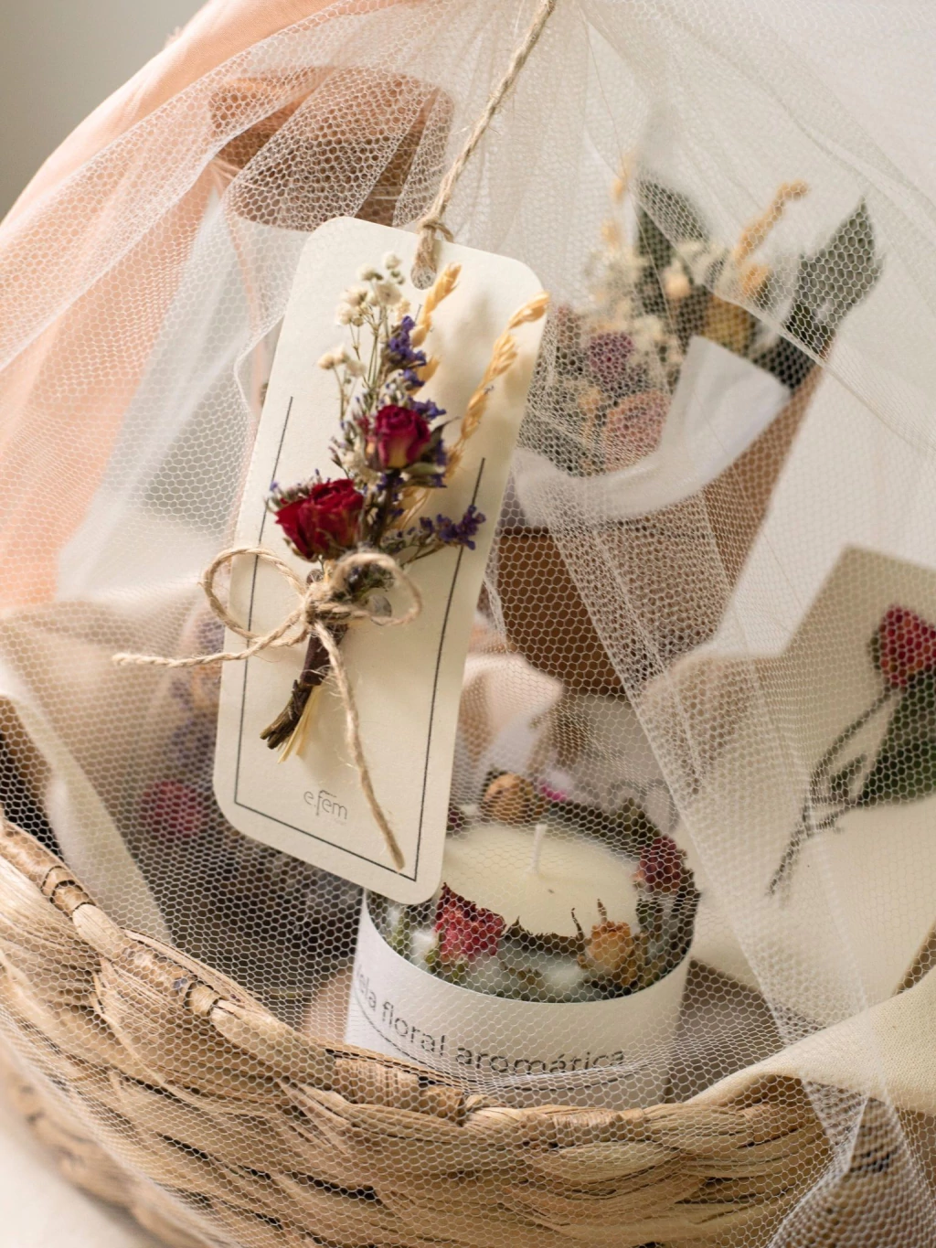 Os produtos vêm em uma cesta de palha natural, embalada com tule e fita de chiffon.