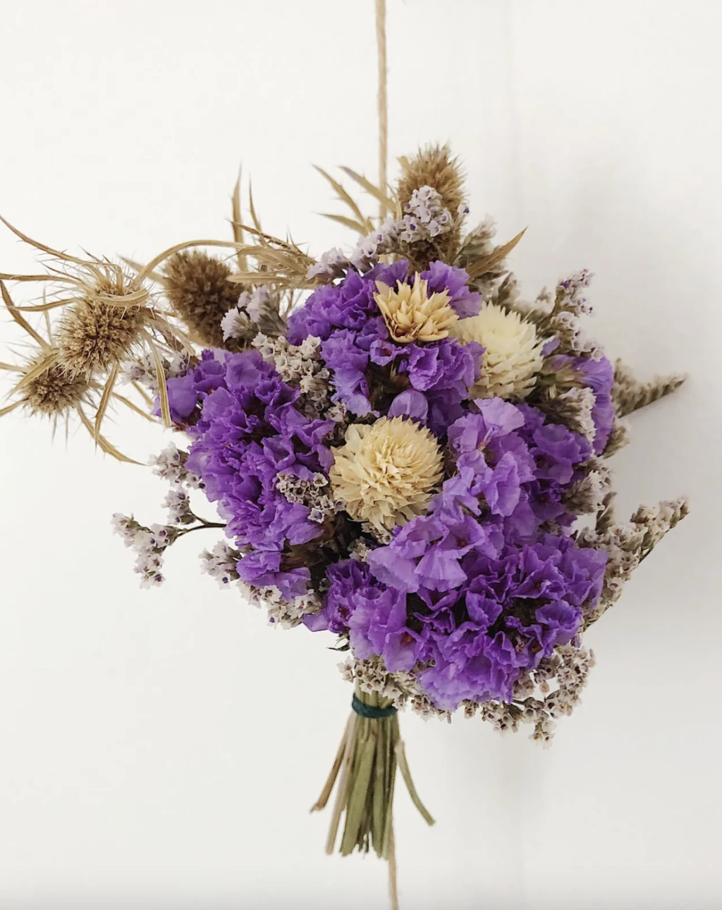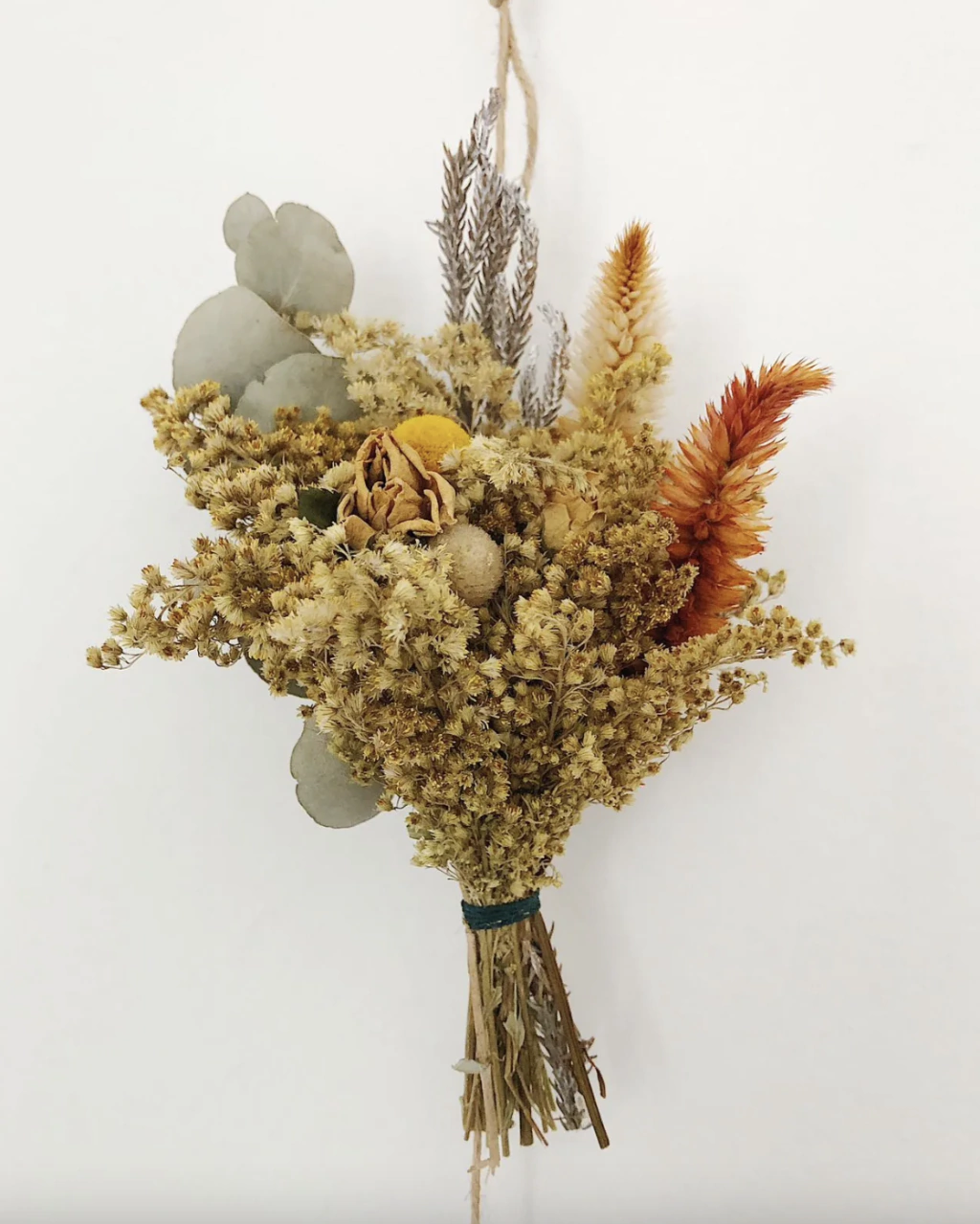 Cordão florido feito com plantas desidratas. São 5 buquês colocados em um cordão de 110cm de altura.
