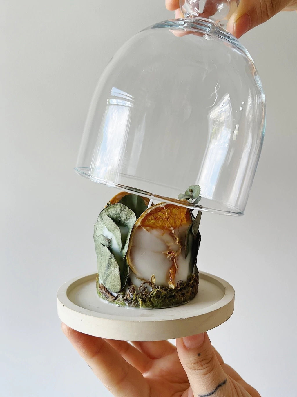 Vela com aroma de Capim-Limão 100% vegetal, feita com um blend de cera de coco, palma e arroz, e pavio de algodão. Produzidas manualmente, são decoradas com plantas naturais desidratadas. Nesta versão, foram usadas folhas de eucalipto e rodelas de laranjas secas.