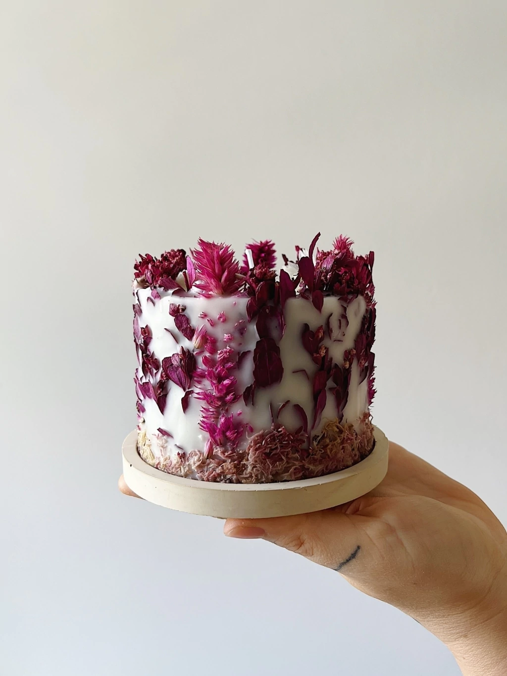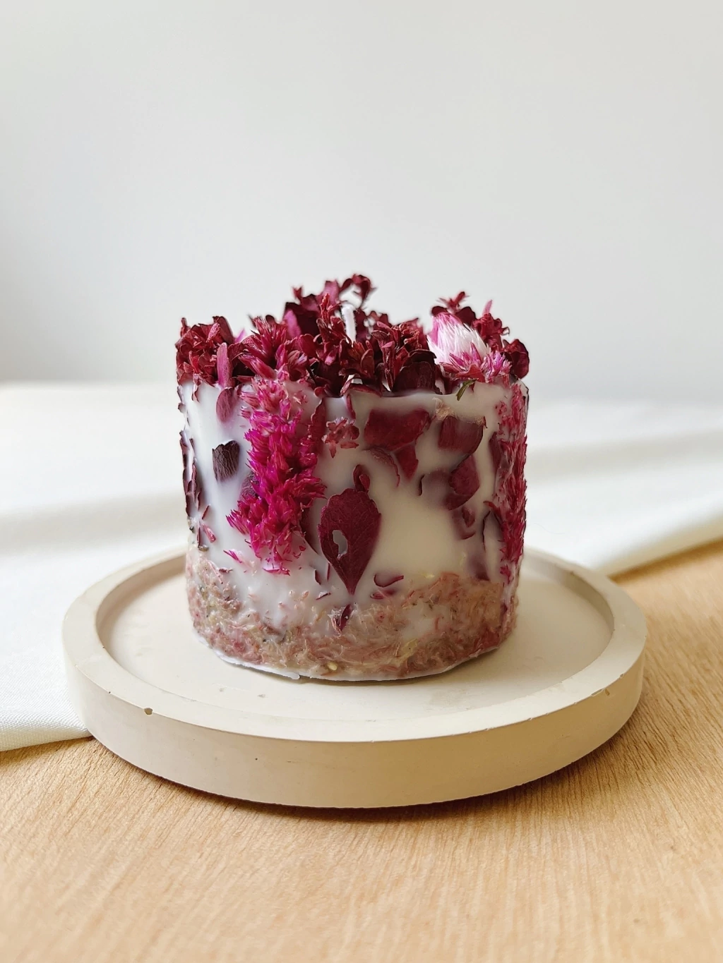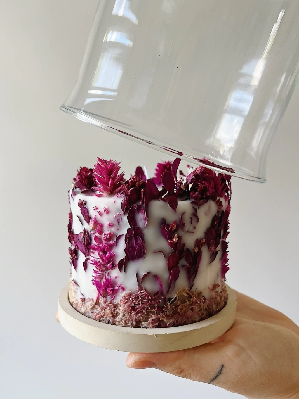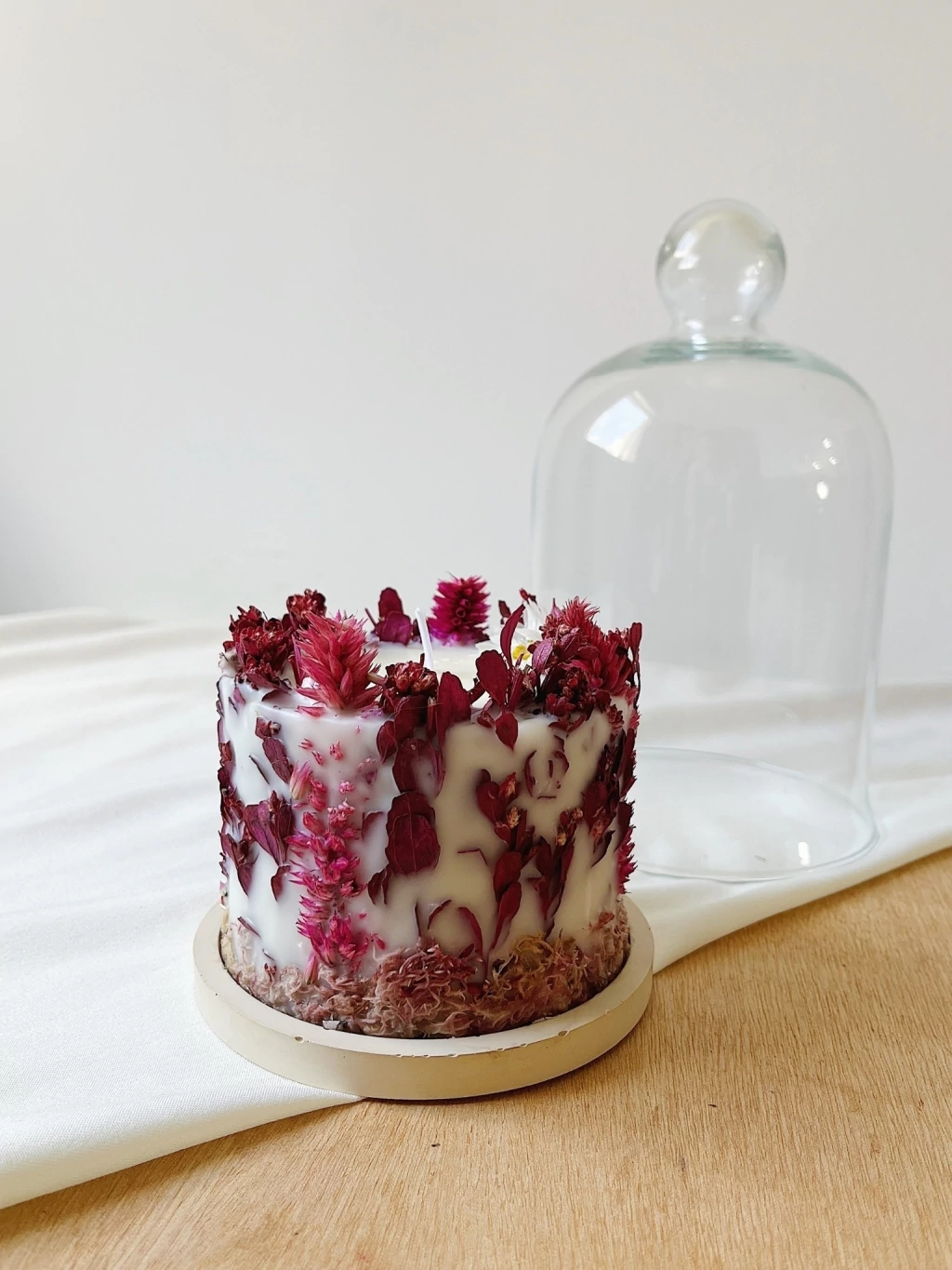 Vela com aroma de Cereja e Avelã 100% vegetal, feita com um blend de cera de coco, palma e arroz, e pavio de algodão. Produzidas manualmente, são decoradas com plantas naturais desidratadas. Nesta versão, foram usadas Musgo rosa, Rabo de gato, Sempre viva Rodante nas cores rosa e branca, entre outras.